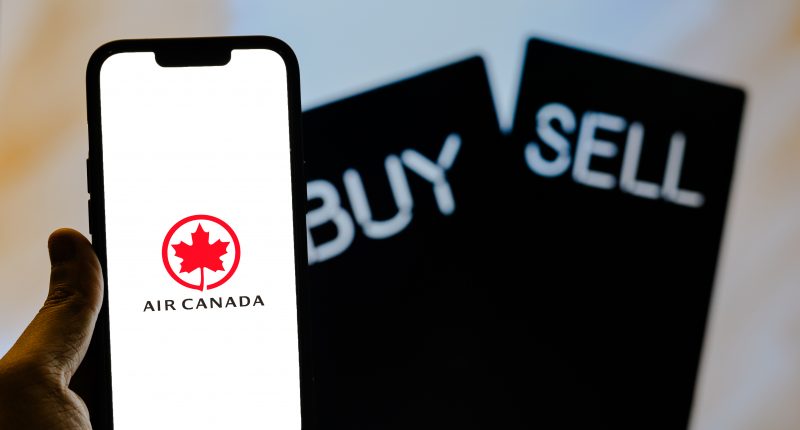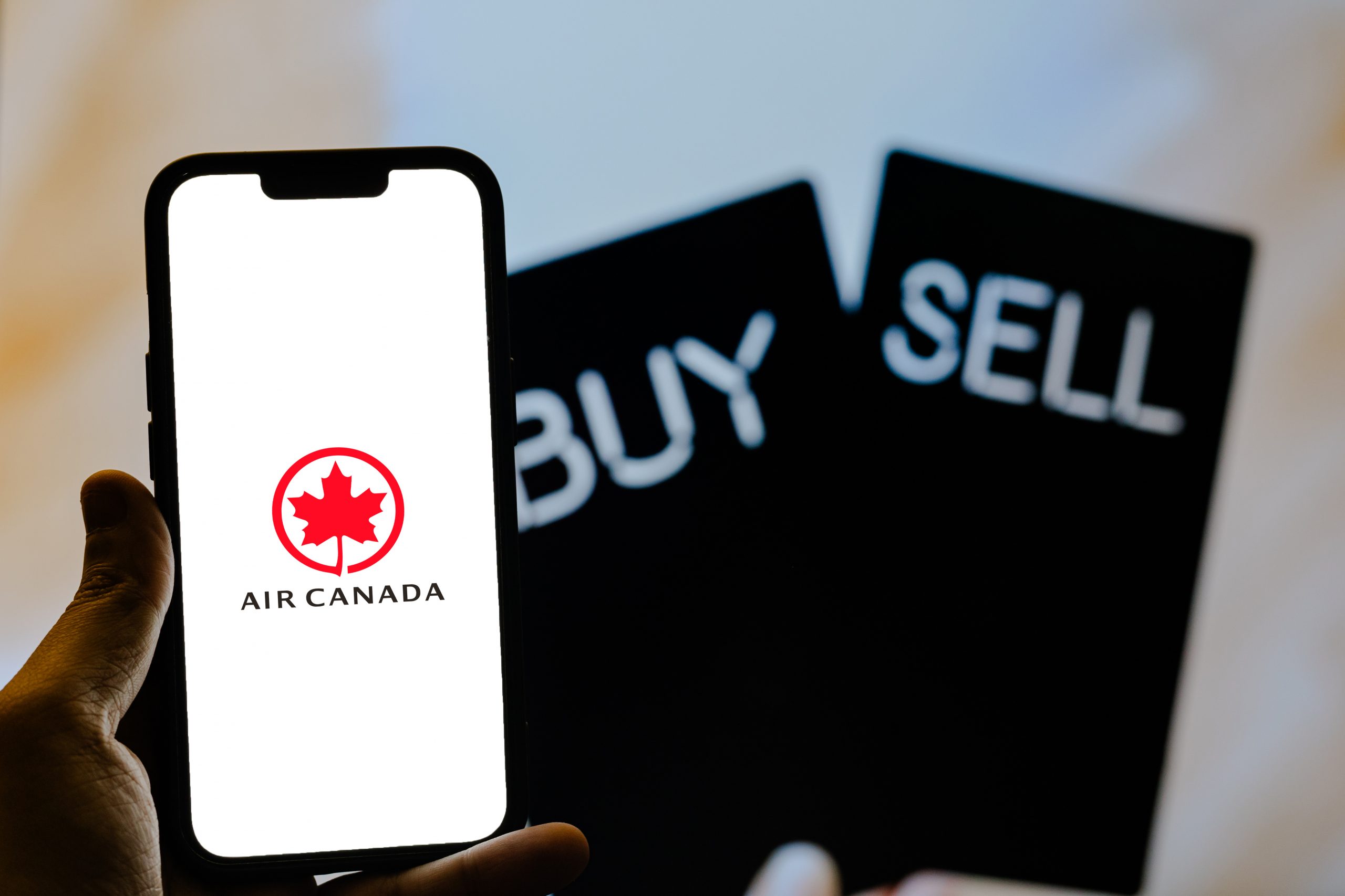 Air Canada logo on cell phone with buy and sell cards. (Source: Adobe Stock)