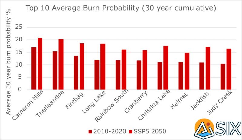 These rankings are based on aggregated 30-year burn probabilities within a 25 km radius of each field, highlighting persistent wildfire hotspots under historical climate conditions.
