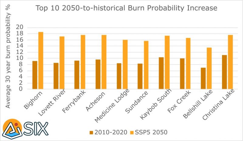 Top 10 fields with highest increase in wildfire probability by 2050 (SSP5 scenario)