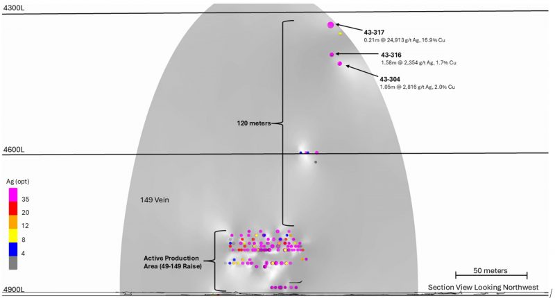 As drilling continues to infill and potentially extend the new mineralization, the 149 Vein is being mined below these intercepts, producing consistent high-grade mill feed of 600-700 tons per cut averaging 700-950 g/t silver and 0.6-0.7 per cent copper. The company increased overall silver production by 54 per cent from 446,000 ounces in Q1 2025 to 689,000 ounces in Q2 2025 while retaining established reserves of 35.7 million ounces, in addition to 40.8 million pounds of zinc, 136.5 million pounds of lead and 33.8 million pounds of copper.