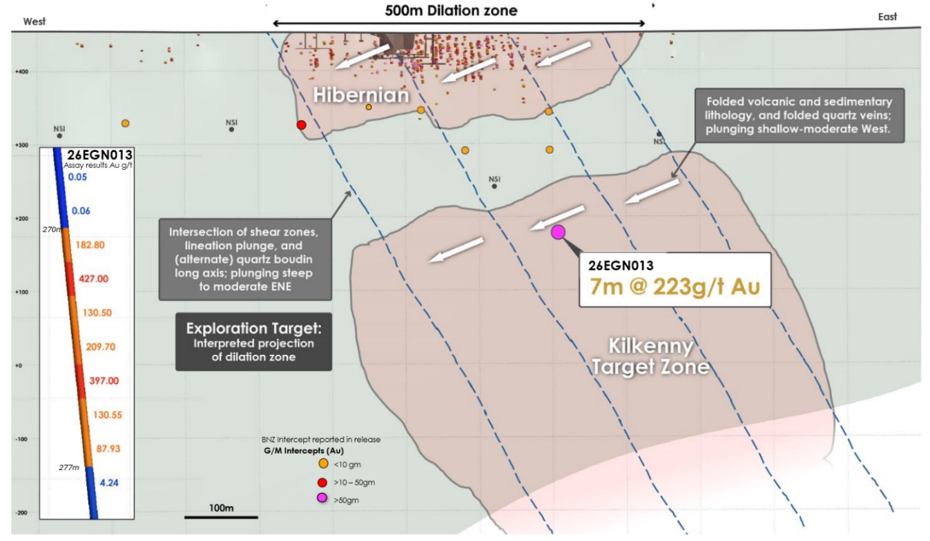 The discovery, now known as the Kilkenny zone, successfully extended Hibernian’s geological setting, which is marked by oblique shear zones that cause dilation and veining within a mafic host rock, representing a well-known structural trap for high-grade orogenic gold. According to Tuesday’s news release, historical drilling at Hibernian yielded up to 9 m at 107.2 g/t gold.