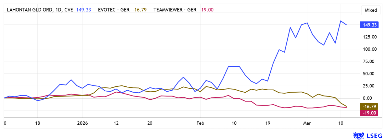 Lahontan Gold’s share price has risen by an impressive 150% over the last three months. The situation was quite different for the two problem children, Evotec and TeamViewer, with restructuring and poor figures. Selection remains key. Source: LSEG from March 12, 2026