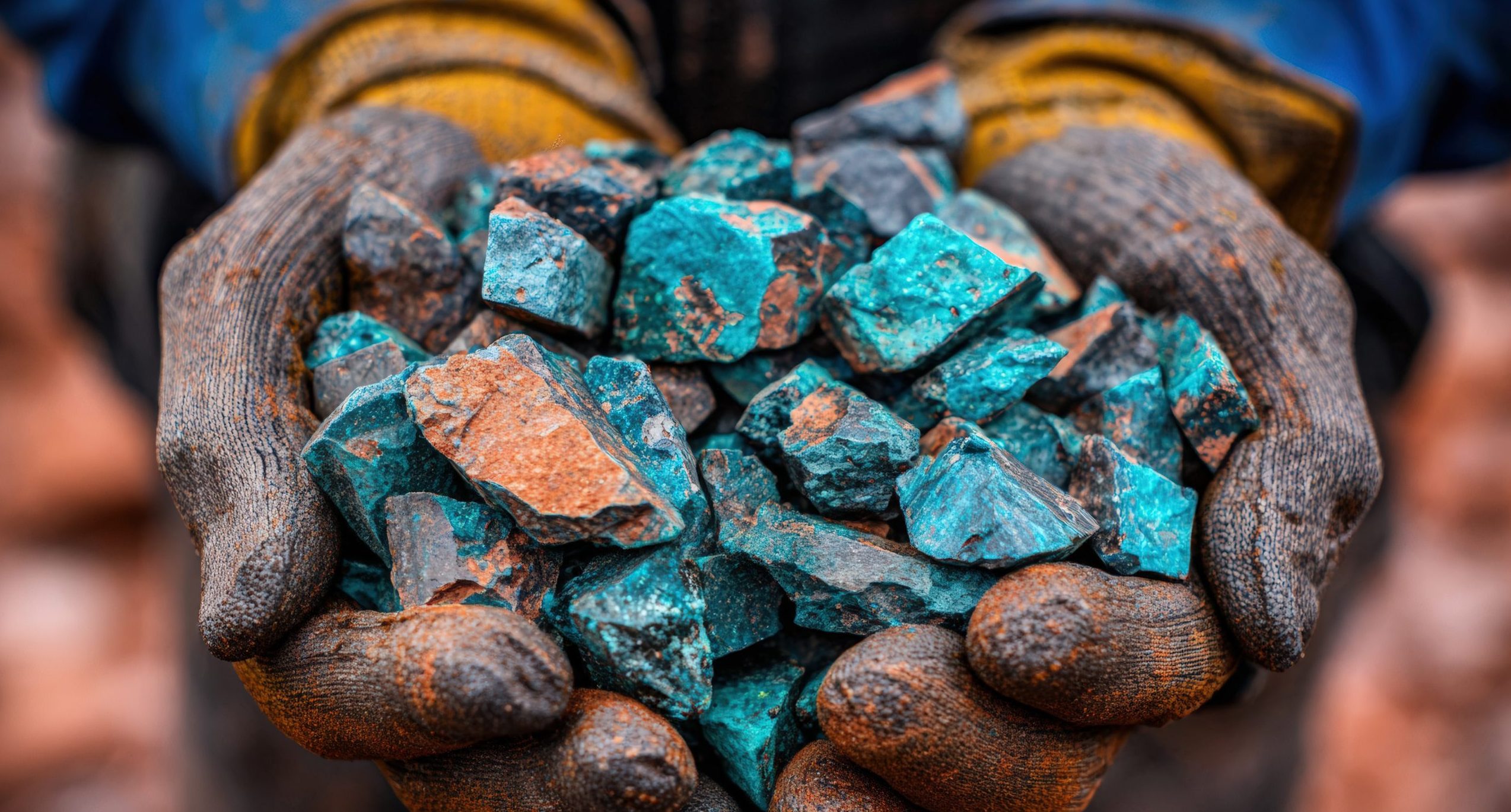 Hands holding copper mineralized rocks. (Source: Adobe Stock. Generated by AI)