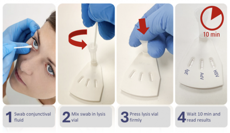 The solution uses a cost-effective, non-invasive microfluidic tear collector, a muti-parametric immunochromatographic test cassette and an-on-cloud deployed interpretation algorithm which can deliver results in less than 10 minutes.