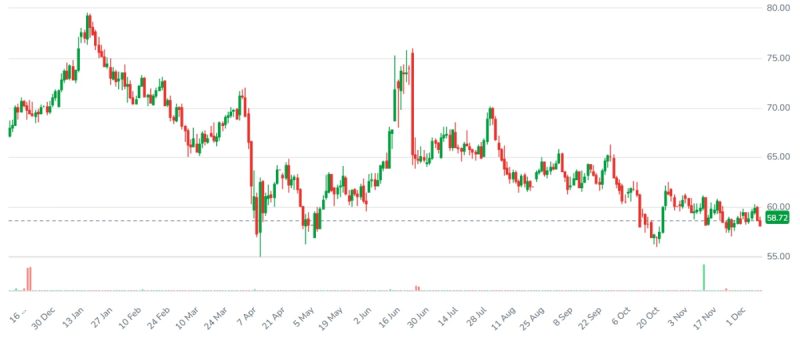 - Second Half 2025: The decline accelerated. September averaged US$66.46, and by November prices were near US$62.34.