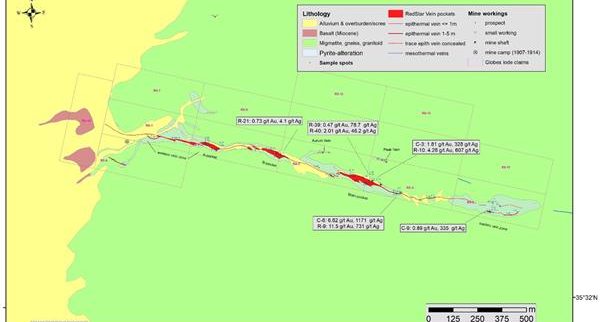 Globex has collected 65 rock samples from the Red Star property, including grab and chip samples. Results from the Red Star vein include widths of up to 4.5 metres with gold values as high as 2.01 g/t and silver up to 46.2 g/t.