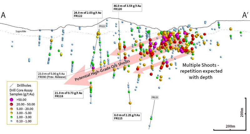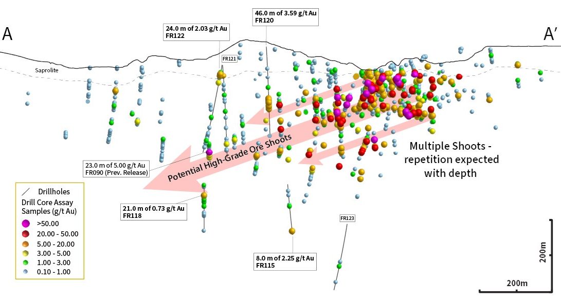 Additionally, parallel shears between Froyo and Donut intercepted 28 m of 1.18 g/t gold from 332 m (FR126), as well as 11 m of 2.32 g/t gold from 397 m (FR123).