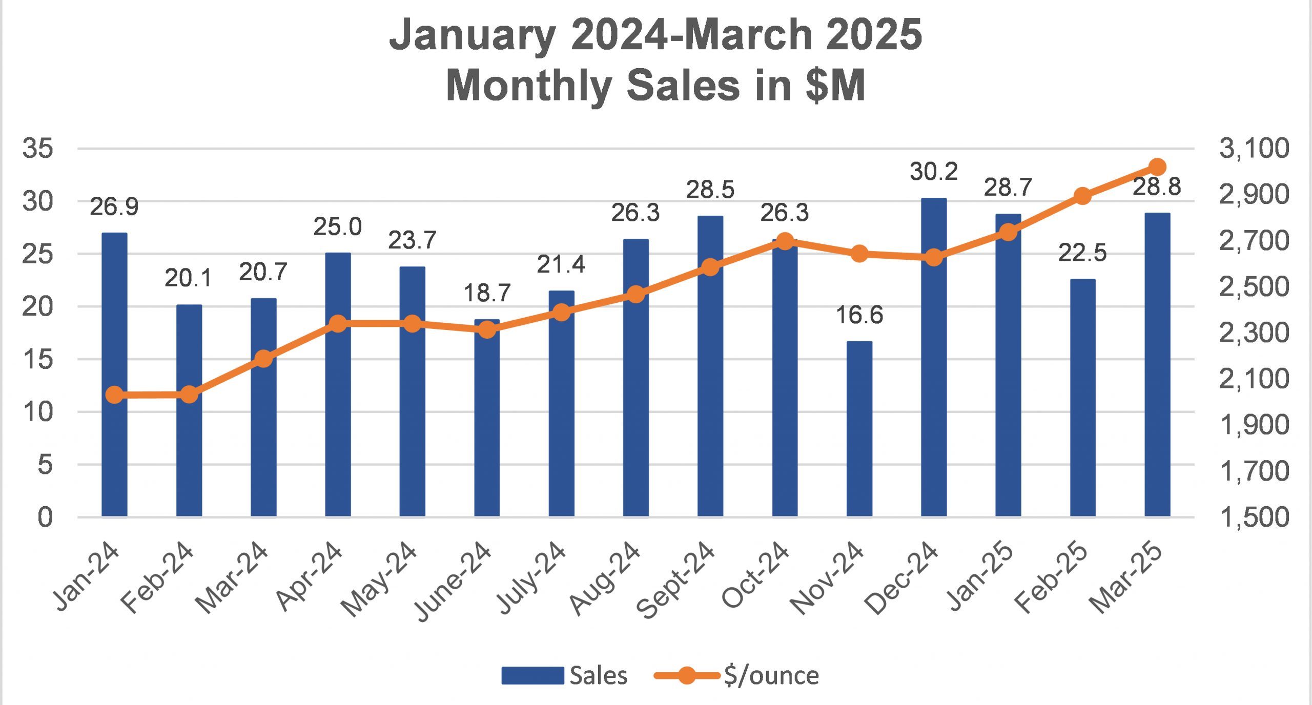 - Dynacor Group (TSX:DNG) reported unaudited gold sales of US$28.8 million in March and record quarterly sales of US$80 million in Q1 2025 from its Veta Dorada plant in Peru