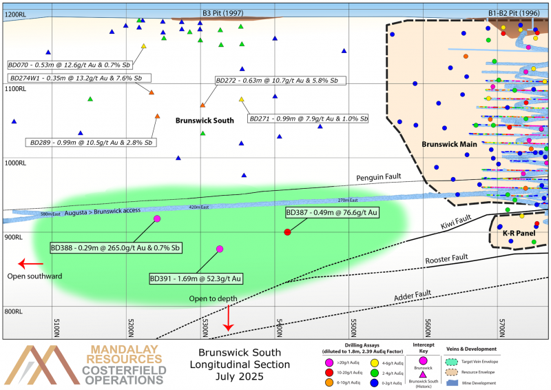 Mandalay has initiated follow-up drilling to explore both strike and down-dip extensions of the new high-grade zone. The program will also assess the up-dip connection to the existing Brunswick South resource. Underground drilling is underway, supported by a surface rig scheduled to arrive in August 2025.