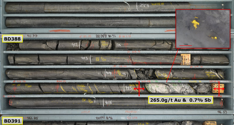 - BD388: 265.0 g/t gold and 0.7% antimony over 0.29 metres (estimated true width: 0.17 m)