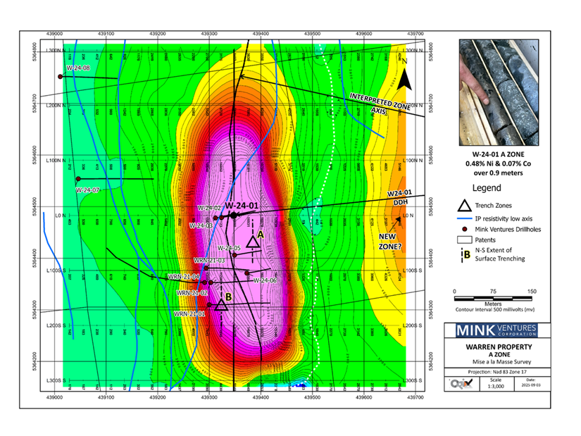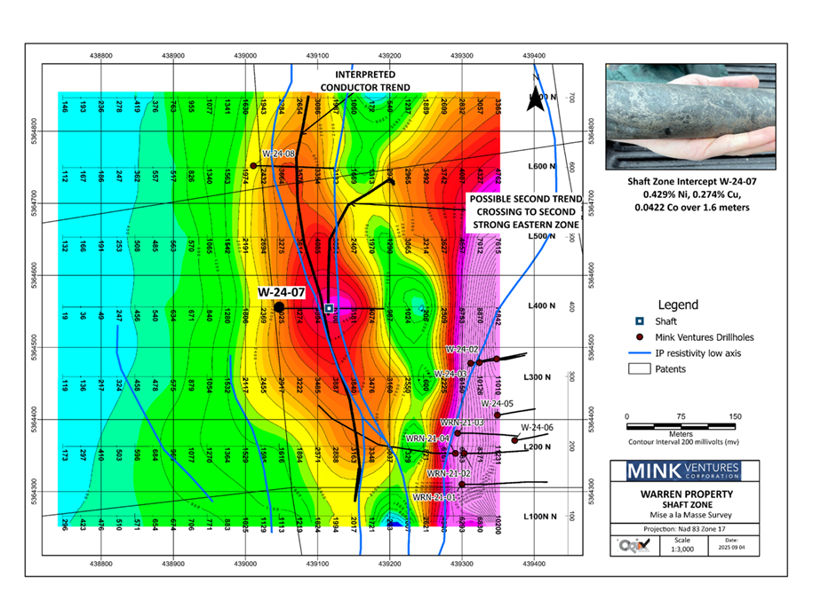 The mise-à-la-masse survey at Mink Ventures’ Warren Project has successfully delineated promising nickel-copper-cobalt targets, refining known zones and uncovering new anomalies that align with strong geophysical and geochemical indicators.