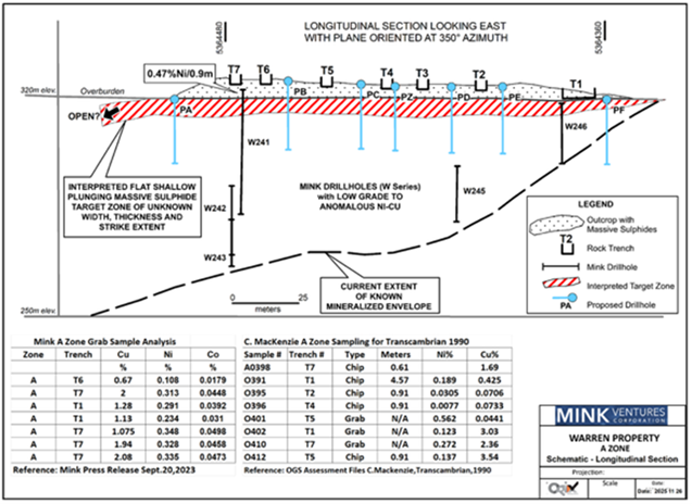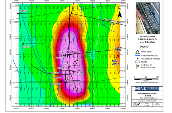 Mink completed a mise-à-la-masse survey at Warren in August 2025. The survey defined a 500 m by 200 m anomalous response of over 16,000 mV at the A Zone (Figure 1). To give some context, a 100–1,000 mV response is indicative of a moderately conductive body, and a 1,000–20,000 mV response is considered an excellent conductor response.