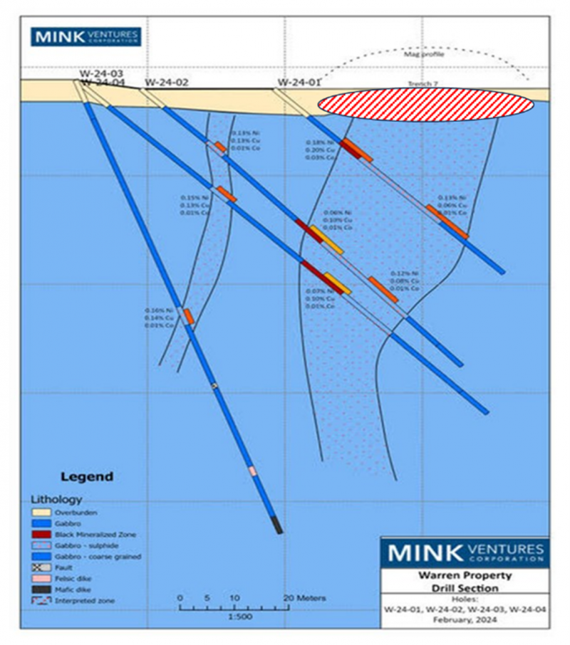 - 3.5 m at an average grade of 0.16% Ni and 0.14% Cu from 56.5 m (W-24-04)