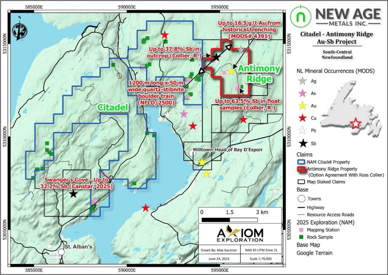 The Antimony Ridge Property, comprising 20 mineral claims over 5 square km under license 035215M, is located approximately 120 km south-southwest of Gander and just six kilometers north of the community of Milltown. Strategically, it lies immediately adjacent to New Age Metals’ wholly owned Citadel Property, enhancing the company’s regional exploration potential.