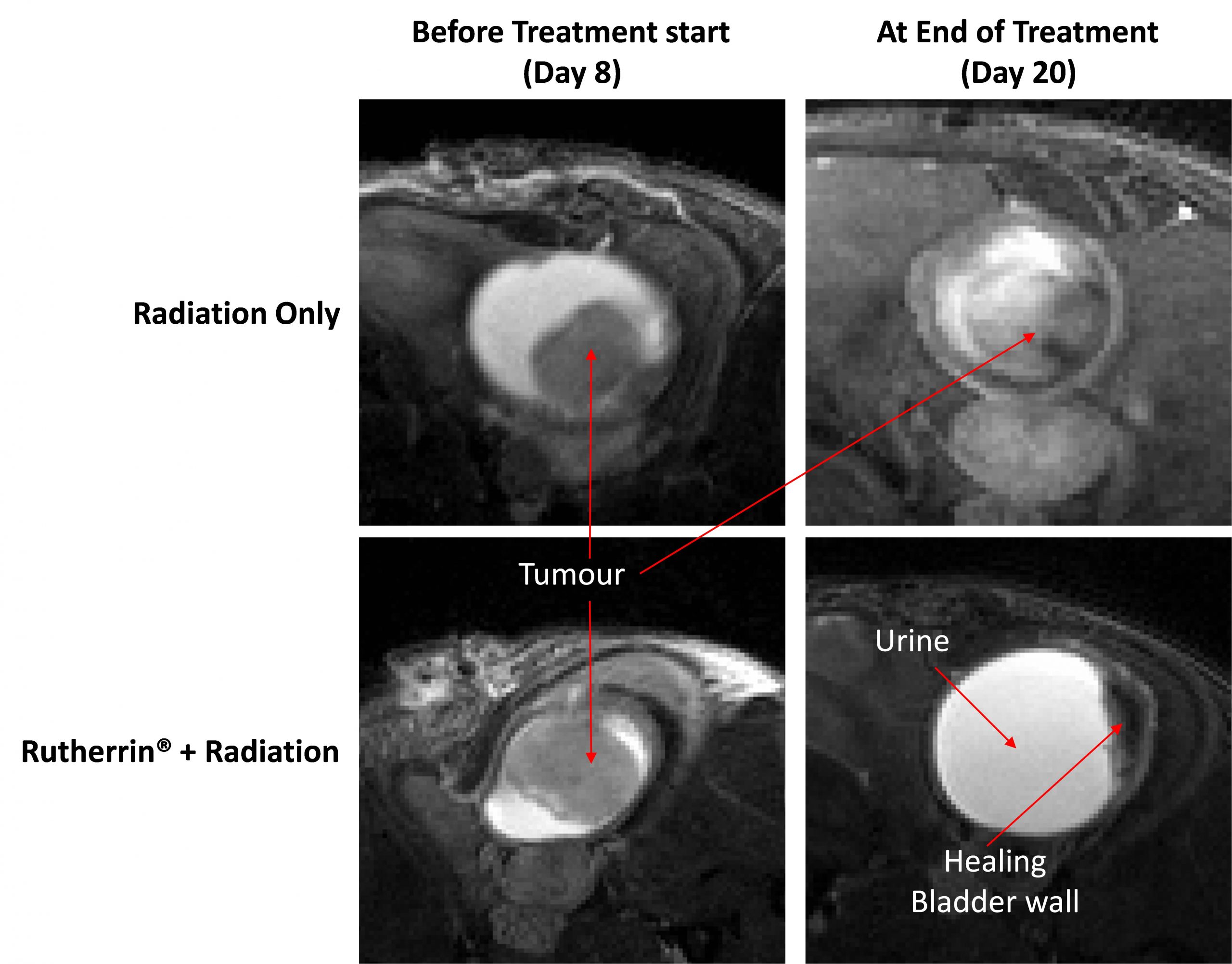 Rutherrin, which relies on energy-activated molecules, enhanced radiation in combination therapy, achieving complete tumor clearance in all mice undergoing treatment, potentially reducing the number of MIBC patients who will eventually require a radical cystectomy or bladder removal. Concurrently, 50 per cent of the radiation-only group showed tumor growth while 50 per cent reached their humane endpoint.