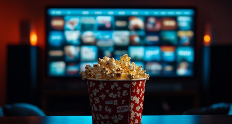 Popcorn bucket and streaming service on TV. (Source: Adobe Stock. Generated by AI)