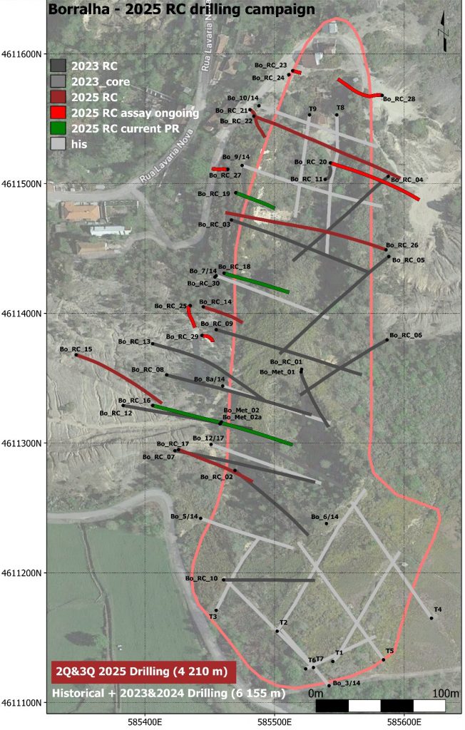 Allied is nearing completion of its 5,625-metre Phase 1 Reverse Circulation (RC) drill campaign at Borralha, with 4,210 metres already drilled. The results continue to exceed expectations, confirming both bulk-mineable zones and high-grade corridors within the Santa Helena Breccia.