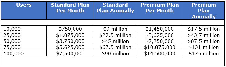 In the table below, we highlight some basic math, multiplying the subscription cost per month versus per year by the number of subscribers (users).