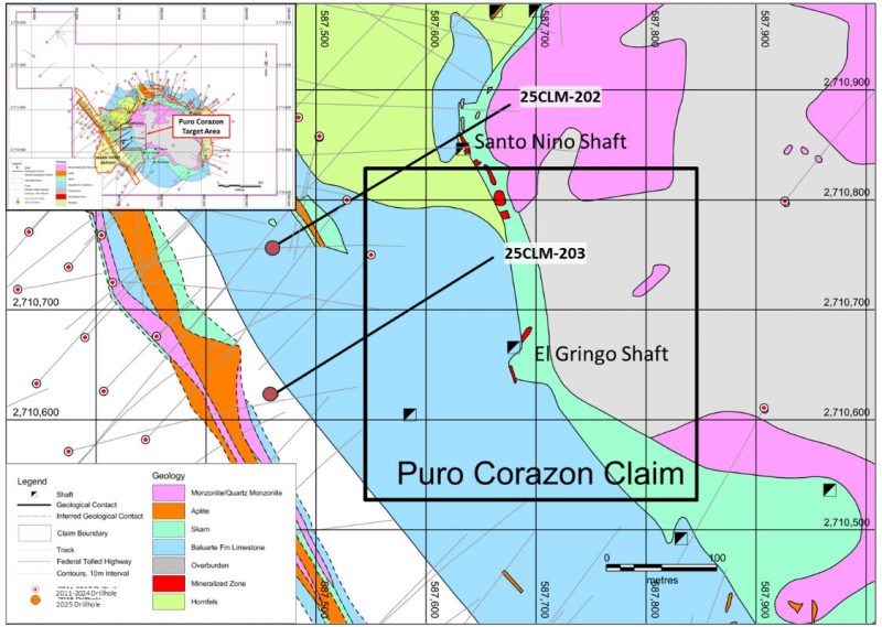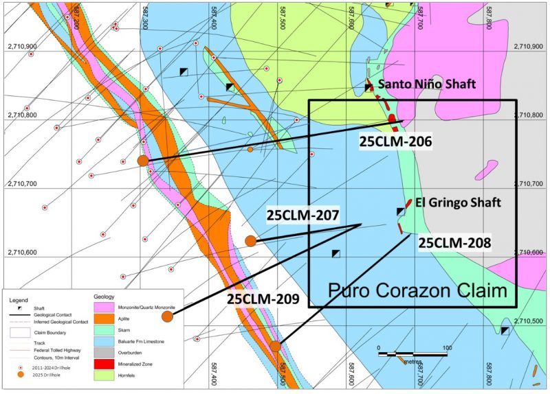 Two narrower, higher‑grade intercepts a few metres deeper composite to 2.6 m at 143 g/t Ag, 4.8 per cent Pb, 1.5 per cent Zn = 280 g/t AgEq. Mineralogy shows up to ~40 per cent sphalerite and 30 per cent galena, with silver strongly correlated to galena—textbook CRD signature in limestone outside the main skarn and historic Puro Corazon workings. Step‑outs cut similar replacement‑style sulphides laterally and at depth (assays pending at the time), and 25CLM‑202 at Santo Niño (north of the claim boundary) returned 2.4 m at 62 g/t Ag, 3.0 per cent Pb, 5.2 per cent Zn = 273 g/t AgEq. (All intervals estimated true thickness unless noted.)