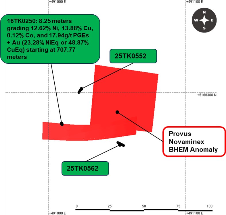 According to Thursday’s news release, Talon is following up to test a borehole electromagnetic anomaly in drillholes 16TK0250, 25TK0552 and 25TK0562, which may indicate nearby high-grade mineralization, as pictured below: