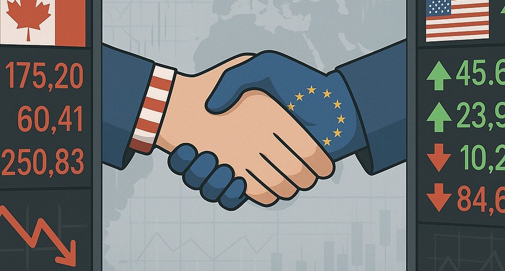 Canada’s main stock index dropped on Monday, mirroring global market downturns, despite a boost in investor sentiment from a newly announced trade agreement between the US and the European Union ahead of the August 1st tariff deadline.