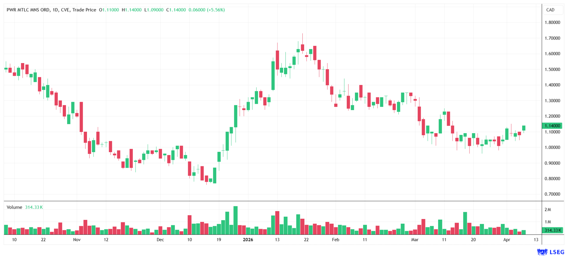 Chart of Power Metallic Mines, as of April 8, 2026. Source: Refinitiv