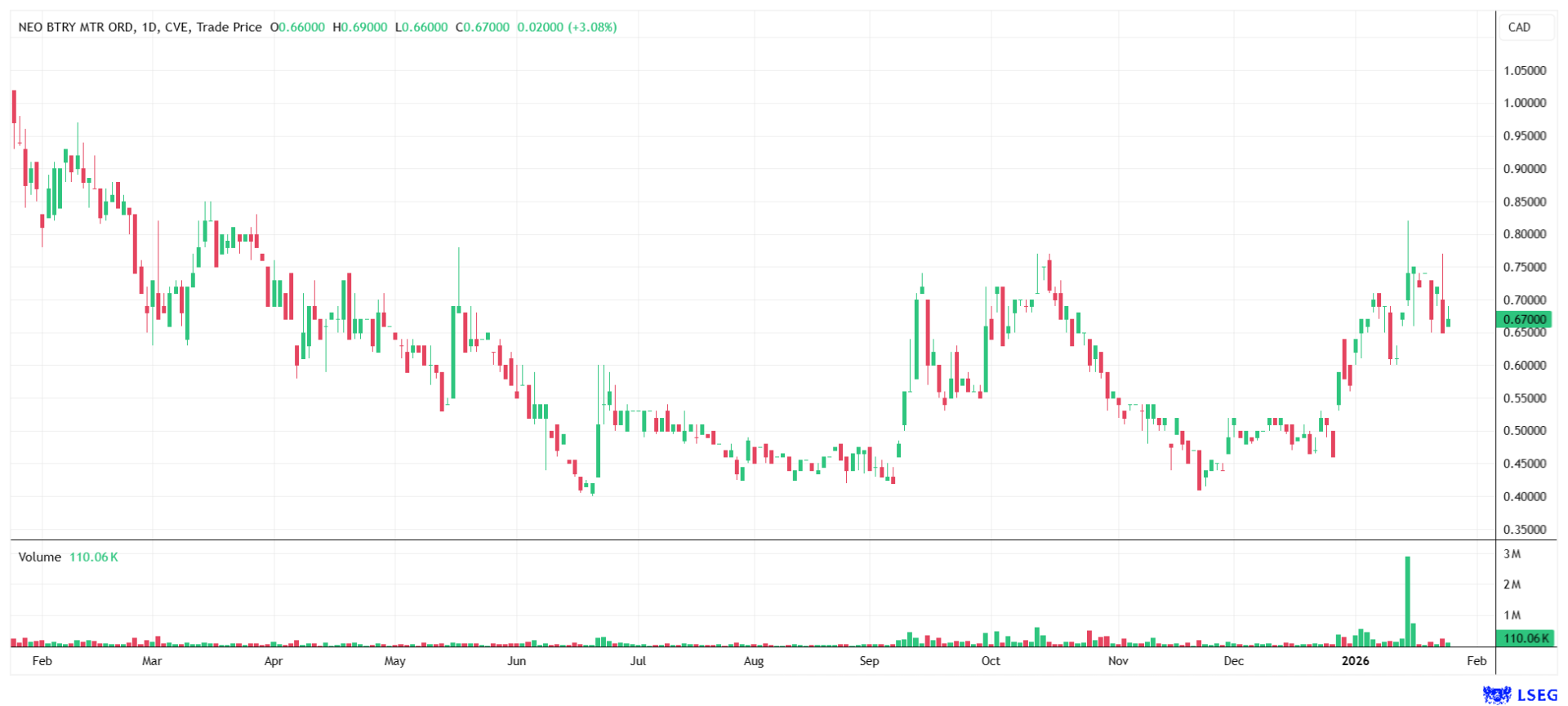 Chart of NEO Battery Materials, as of January 26, 2026. Source: Refinitiv