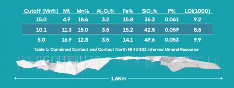 - NI 43‑101 inferred resource: 11.3 million tonnes grading 15.0 per cent Mn at a 10.1 per cent Mn cut-off