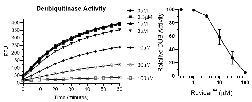 Ruvidar has been shown to induce oxidative stress in cancer cells through the production of Reactive Oxygen Species (ROS), facilitating their destruction without affecting healthy cells. The drug – alone and/or in combination with Transferrin to produce the compound Rutherrin -has delivered promising results against bladder cancer, lung cancer, as well as various viruses, including recent breakthroughs in the treatment of herpes. The chart below depicts Ruvidar’s latest potential use-case as a DUBs inhibitor: