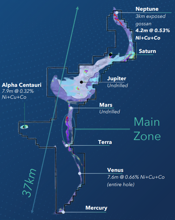The project’s highest-priority target, the Kraken Main Zone, encompasses a 5-km conductor founded on historical intercepts by mining majors, including Noranda Kennecott’s 8 metres grading 0.5 per cent nickel-copper-cobalt and Teck Resources’ standout 46 metres at 0.3 per cent copper-nickel-cobalt (from 2 metres).
