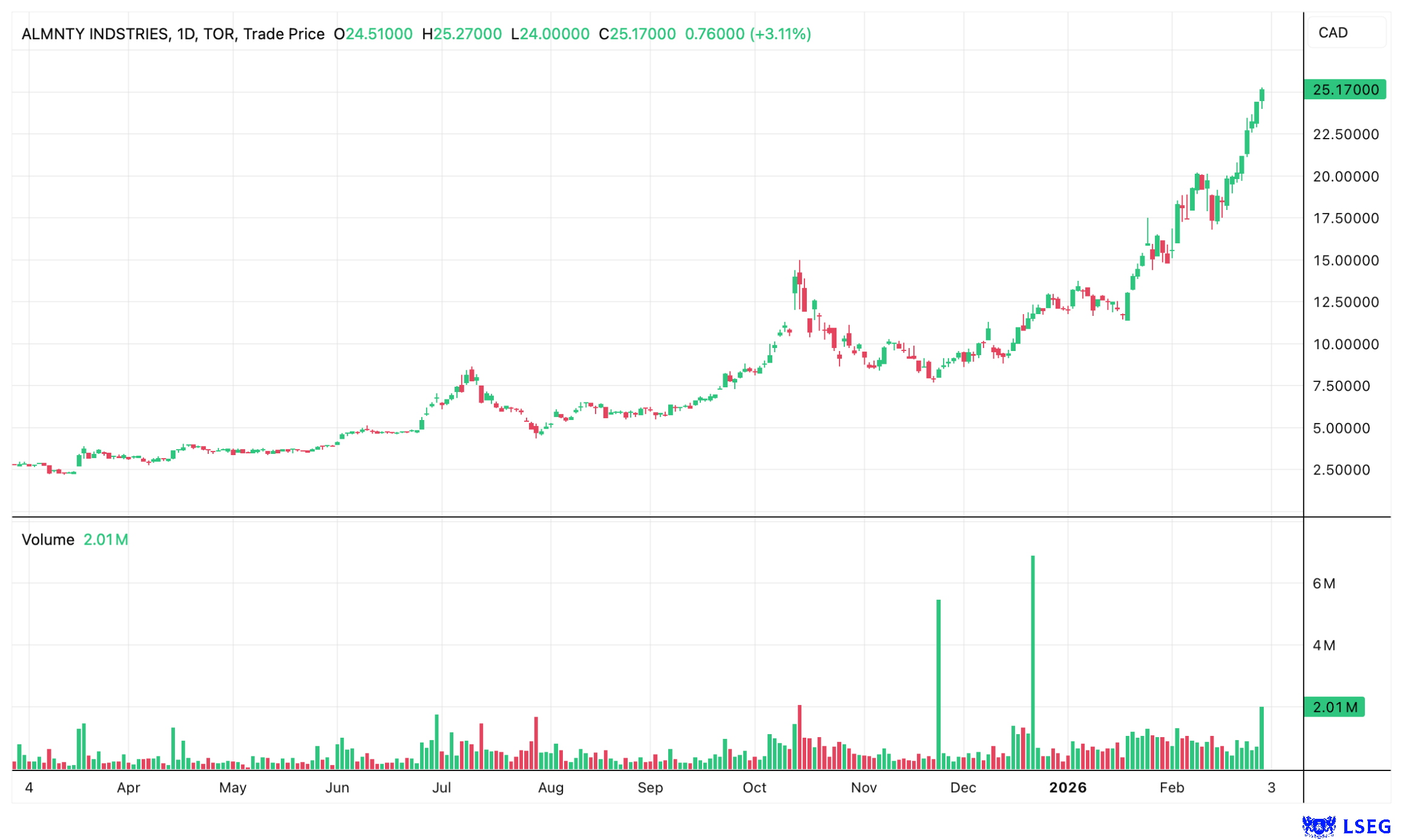 Anyone considering investing in tungsten cannot ignore Almonty’s stock. The heavy metal with the element symbol W and atomic number 74 is not traded on any futures exchange. In Rotterdam, one of the most important hubs for the import, storage, and transhipment of raw materials, the main commodity traded is the tungsten-containing powder ammonium paratungstate (APT) – privately and at prices currently averaging around USD 1,700 per metric ton (MTU). This sounds quite modest compared to the price of gold (USD 167 million per ton), but the immense price increase nevertheless presents processors and consumers with the problems described by “Plusminus.” The doubling of the APT price since the beginning of the year is only the tip of the iceberg. Since the beginning of 2025, the price has actually increased fivefold.