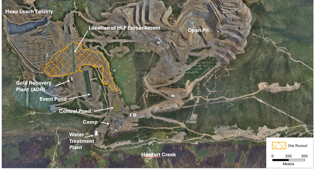 (Top photo showing an aerial view of Eagle Gold mine with extent of June 24, 2024, heap leach incident outlined in yellow: Victoria Gold Corp.)