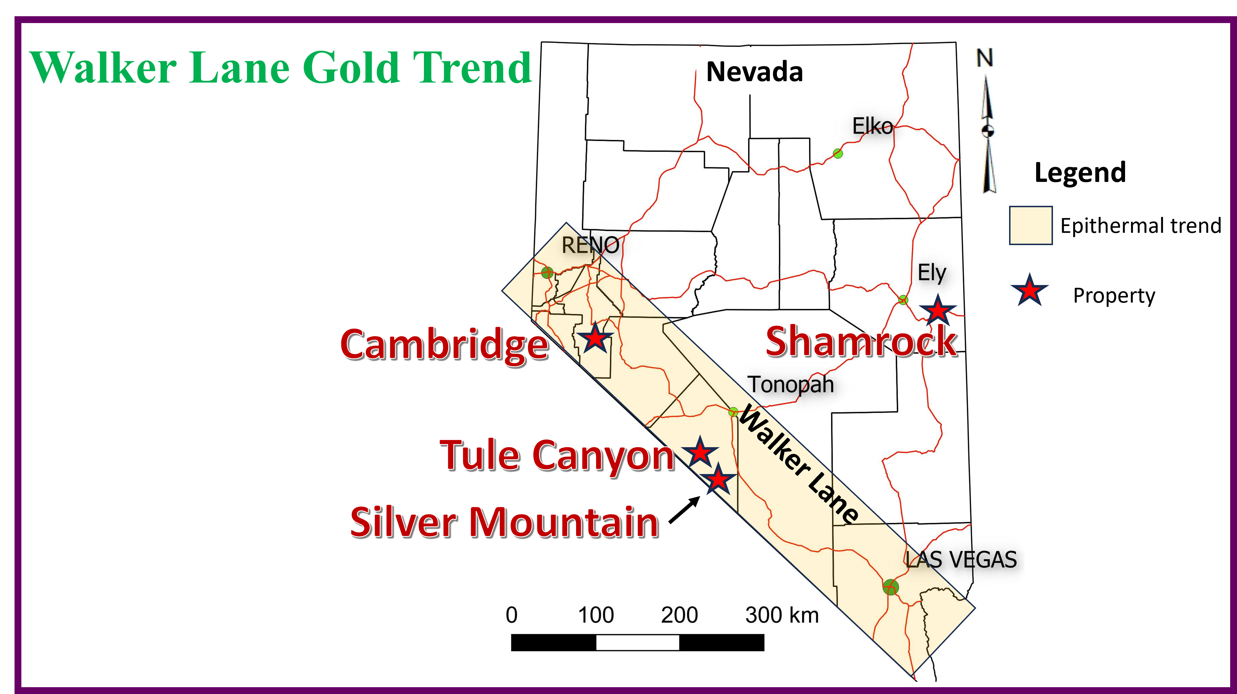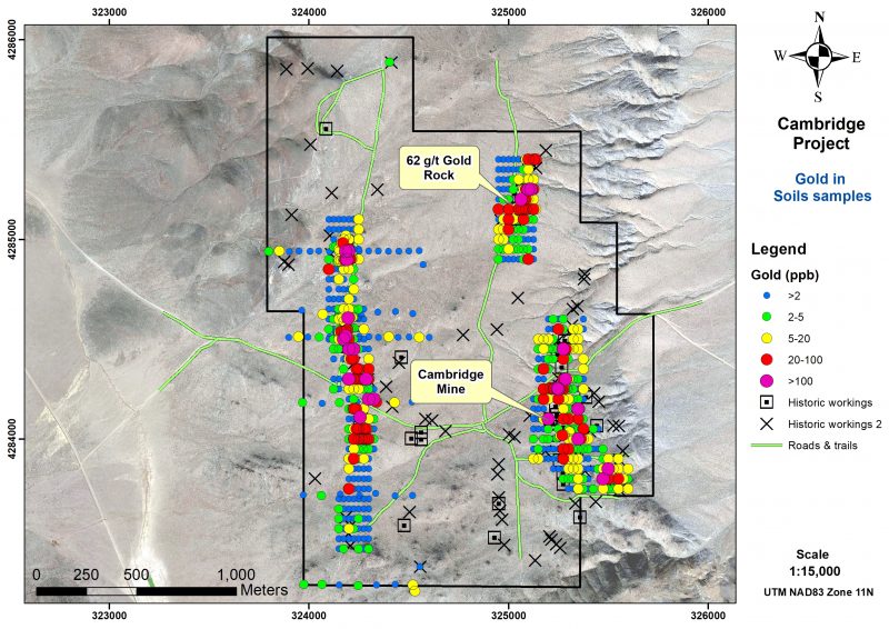 The road-accessible property’s exploration history dates back to the 1860s, with Henry Blasdel, Nevada’s first state governor, purchasing the Cambridge Mine to the southeast in the 1870s, prompting production of about 10,000 tons grading 0.3 ounces per ton at a nearby mill into the late 1800s. Besides a reactivation by Cambridge Mining Corp. from 1940 to 1942, and a brief period of exploration in the 1960s, there has been no major mining on the property ever since.