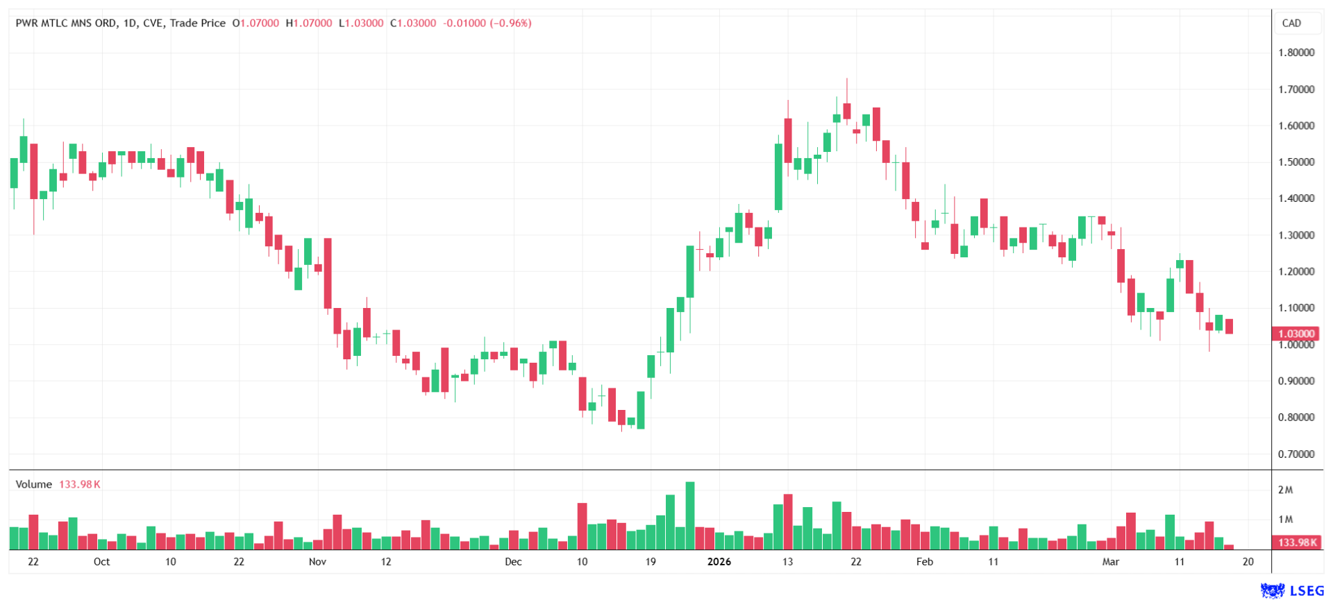 Chart of Power Metallic Mines, as of March 18, 2026. source: Refinitiv