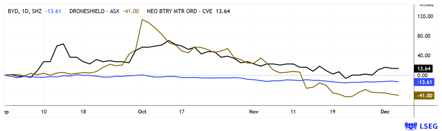 In a 3-month comparison, NEO Battery Materials shares are ahead. While BYD and DroneShield are down 14% and 41% respectively, NEO has recently turned around and is heading upwards. Dynamic investors should prepare for a good year in 2026. Source: LSEG, December 4, 2025